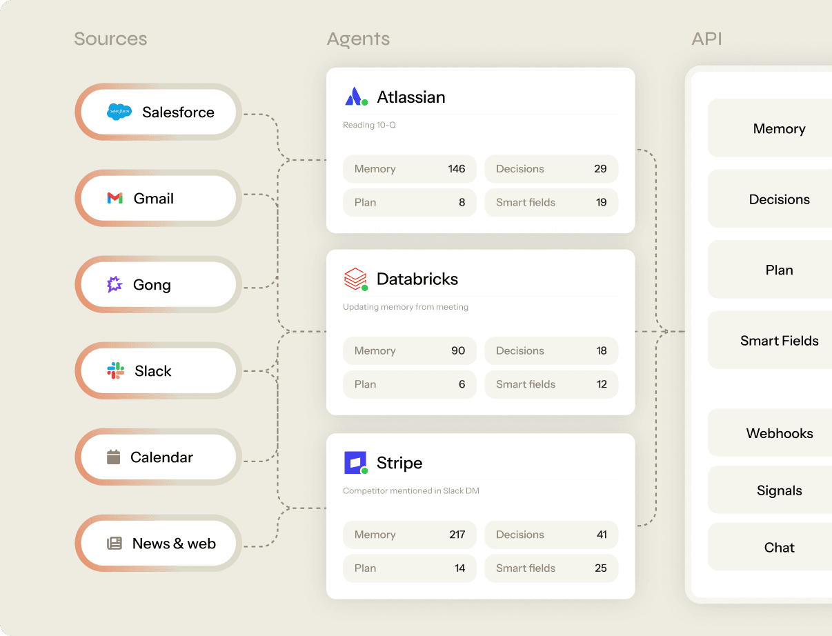 The Per-Account Agent does the work 24/7. Agent Inbox, Assistant, Watchtower, Smart Fields, and the API are how that work surfaces — to your reps, your CRM, your leaders, and your broader stack.