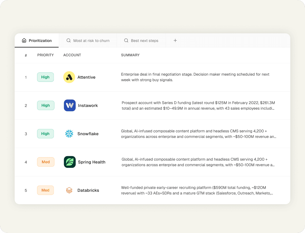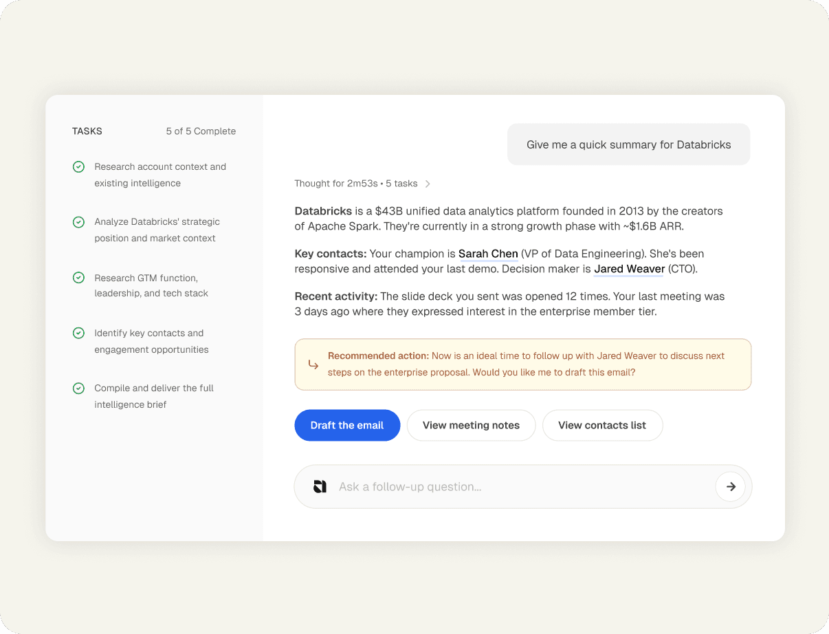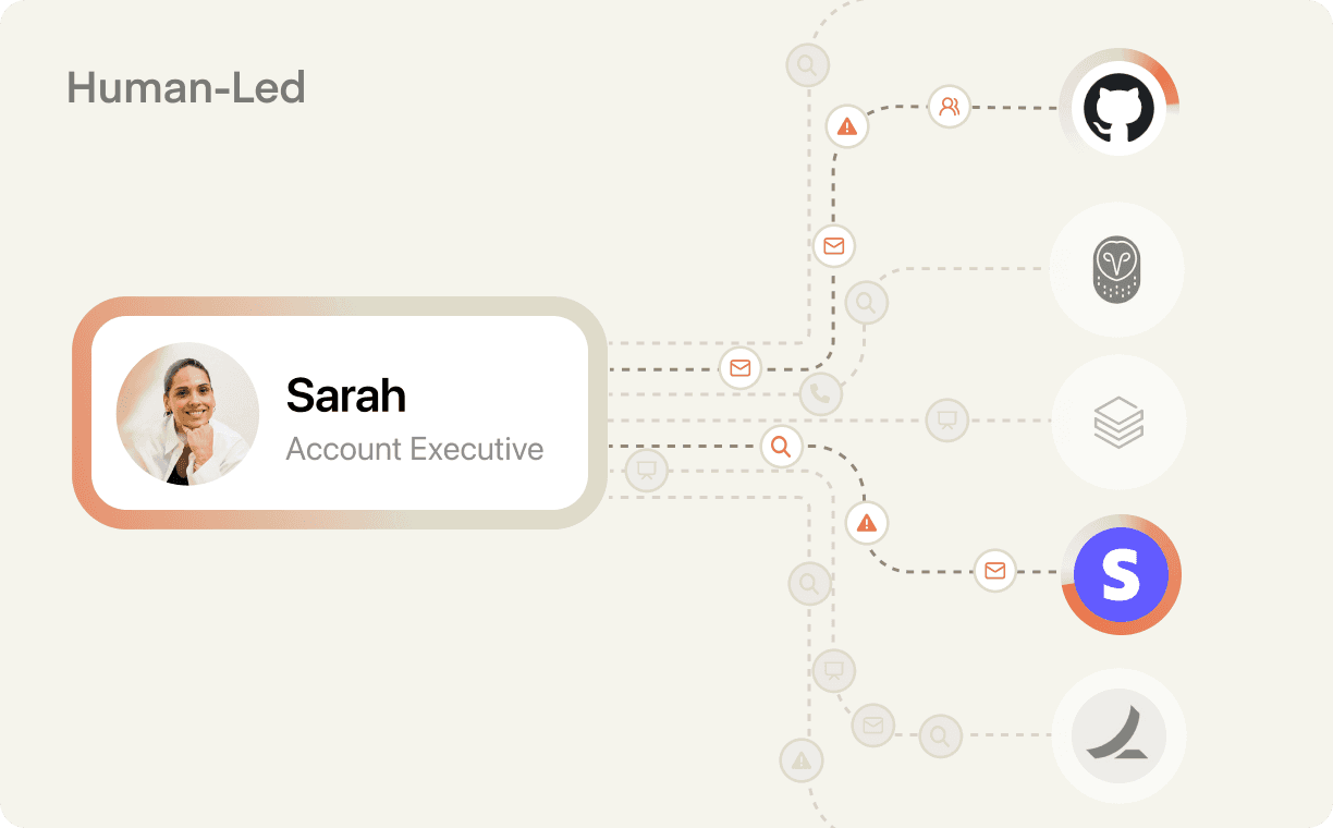 Every account gets its own dedicated agent working proactively 24 hours a day, forever. Those agents tell your reps what to do next, and helps them do that work. You go from one human reactively covering 200 accounts to 200 agents working every single one across SDRs, AEs, AMs, and Leaders simultaneously.
