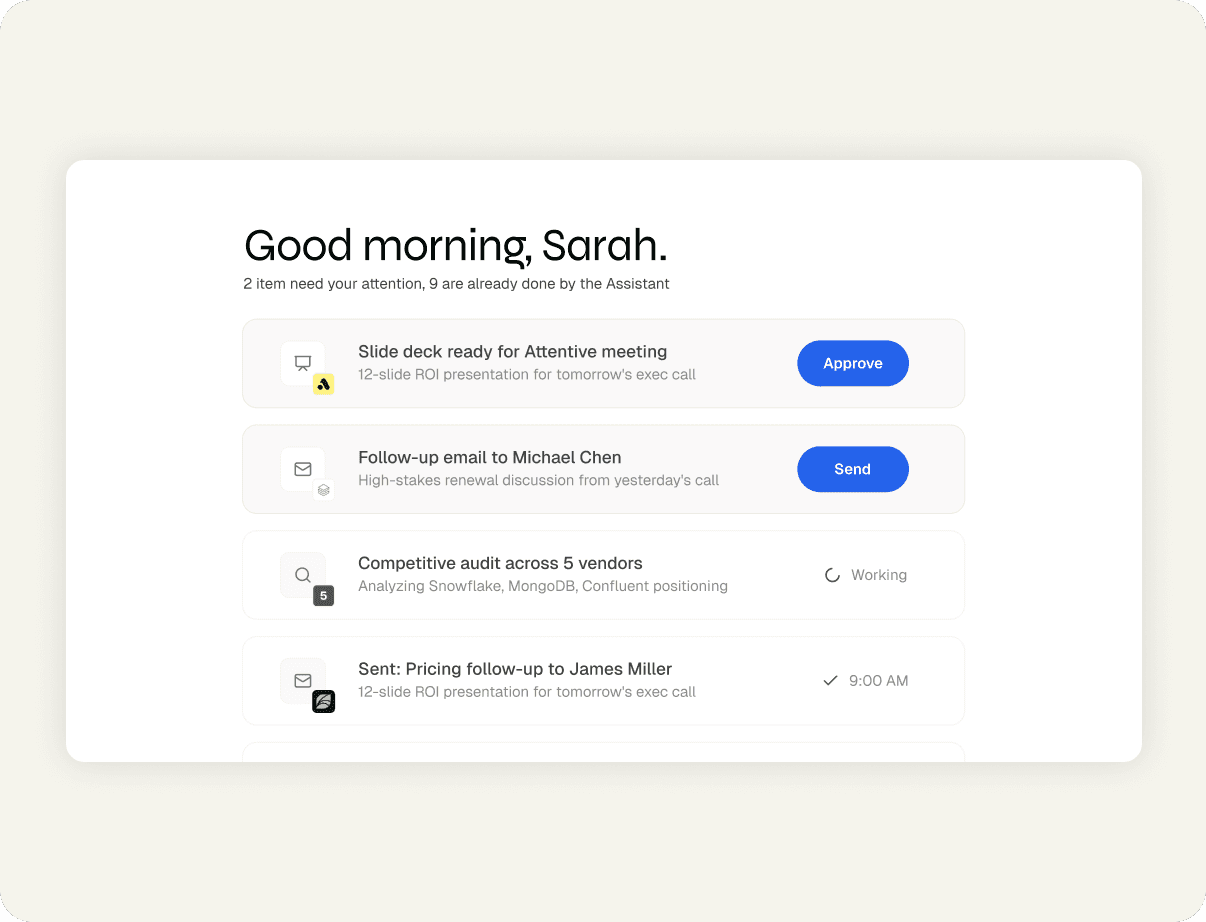 Per-Account Agents that work proactively, 24/7 to drive outcomes across every team in your organization.