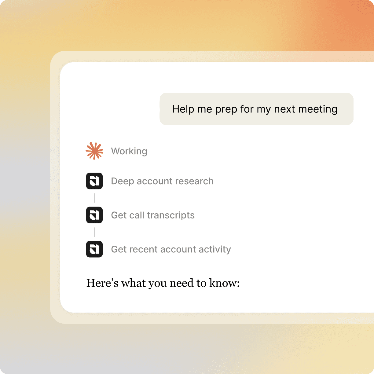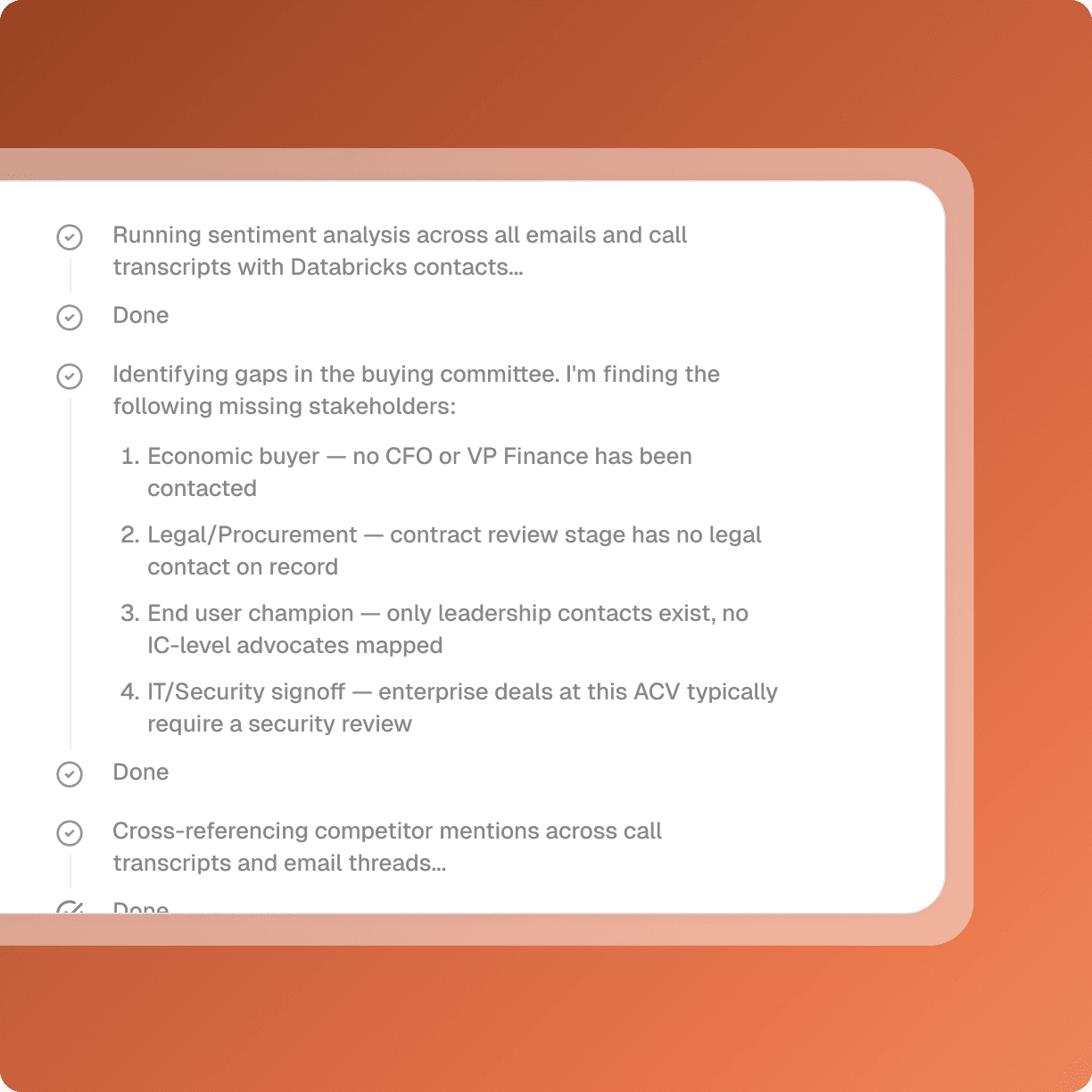 Agents don't just provide a readout of what's happening. It is reasoning through every relevant data point and produces contextual assets that reps can use immediately.