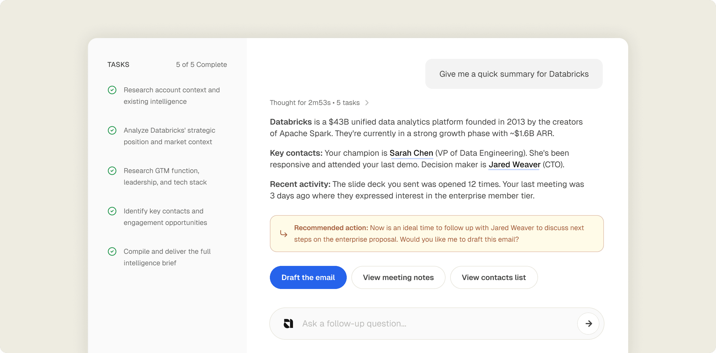 Every answer pulls from what your agents know across the entire account history, and knows what to do next to progress it forward.