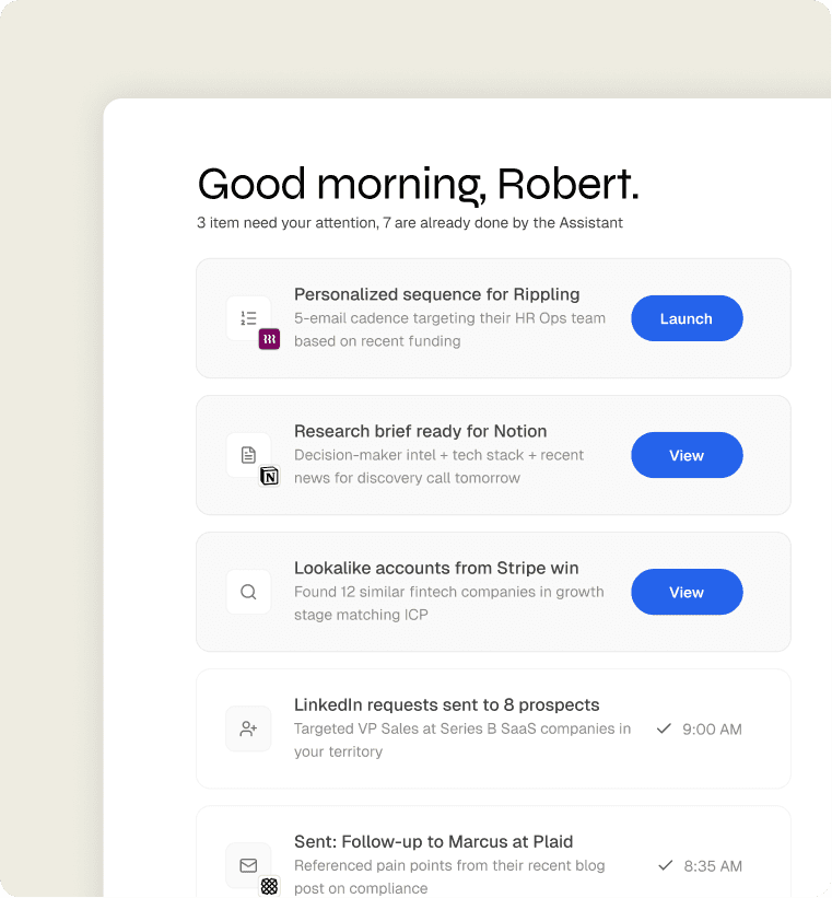 Actively deploys an AI agent on every prospect in your territory, monitoring signals, drafting outreach, and surfacing the right accounts at the right moment. Before you've opened your laptop.